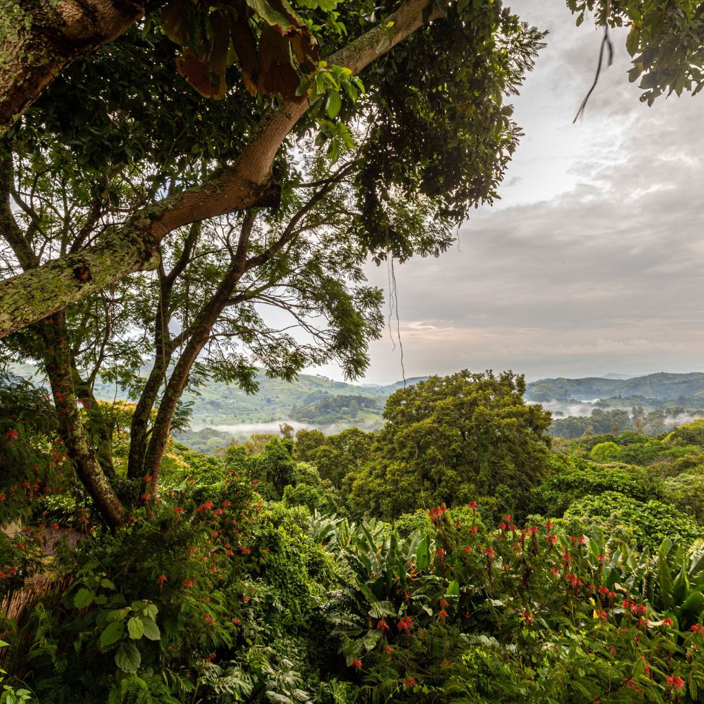 “The endless view to one side of the equator is of promiscuously lush woodland and steep fields shaved, stubbled and bearded with edible greens, all puny beneath the snow-capped Mountains of the Moon.”