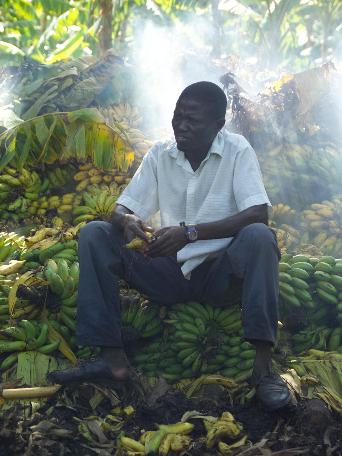 Akora Headman sitting amid a heap of Ndali’s kisubi bananas