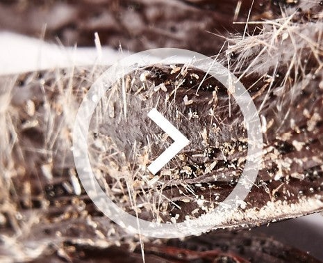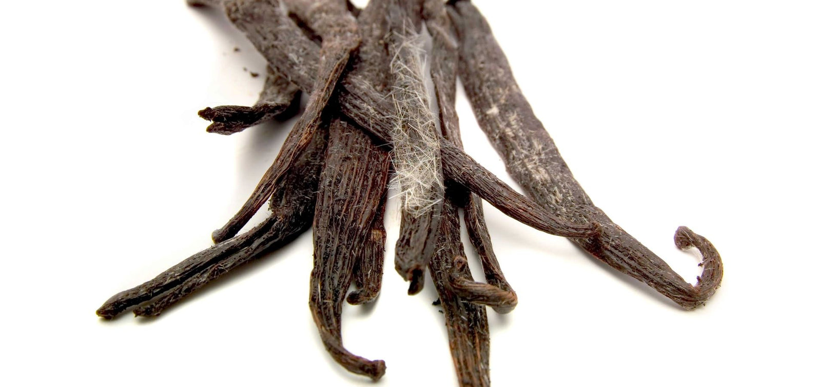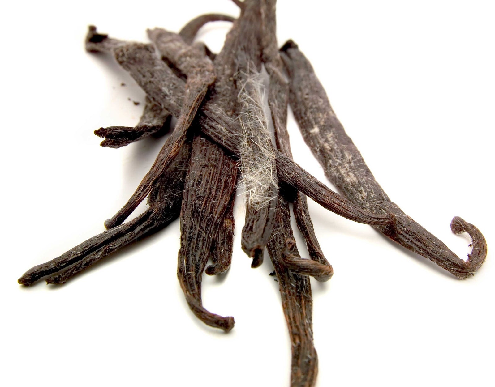 The rare white or iridescent vanillin crystals can look like an explosion of downy frost, fine hairs, or shards of fibreglass. Do not confuse them with mould which looks quite different and will often emerge on vanilla harvested prematurely, or which has been poorly conditioned during curing.