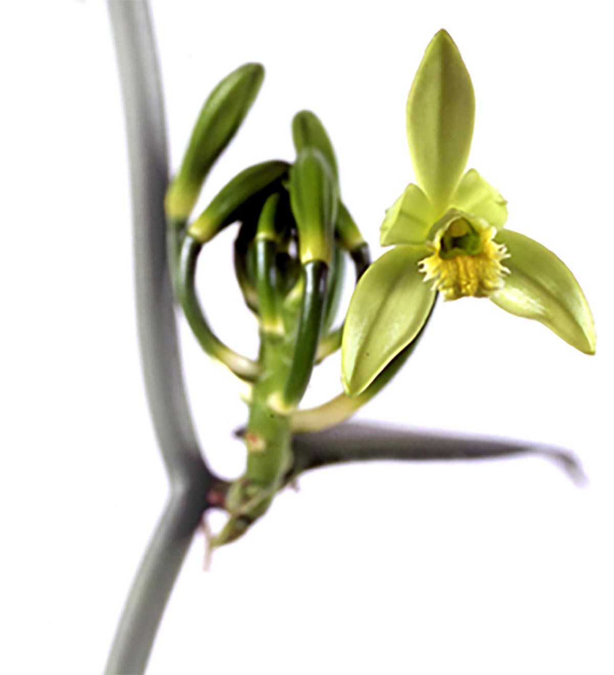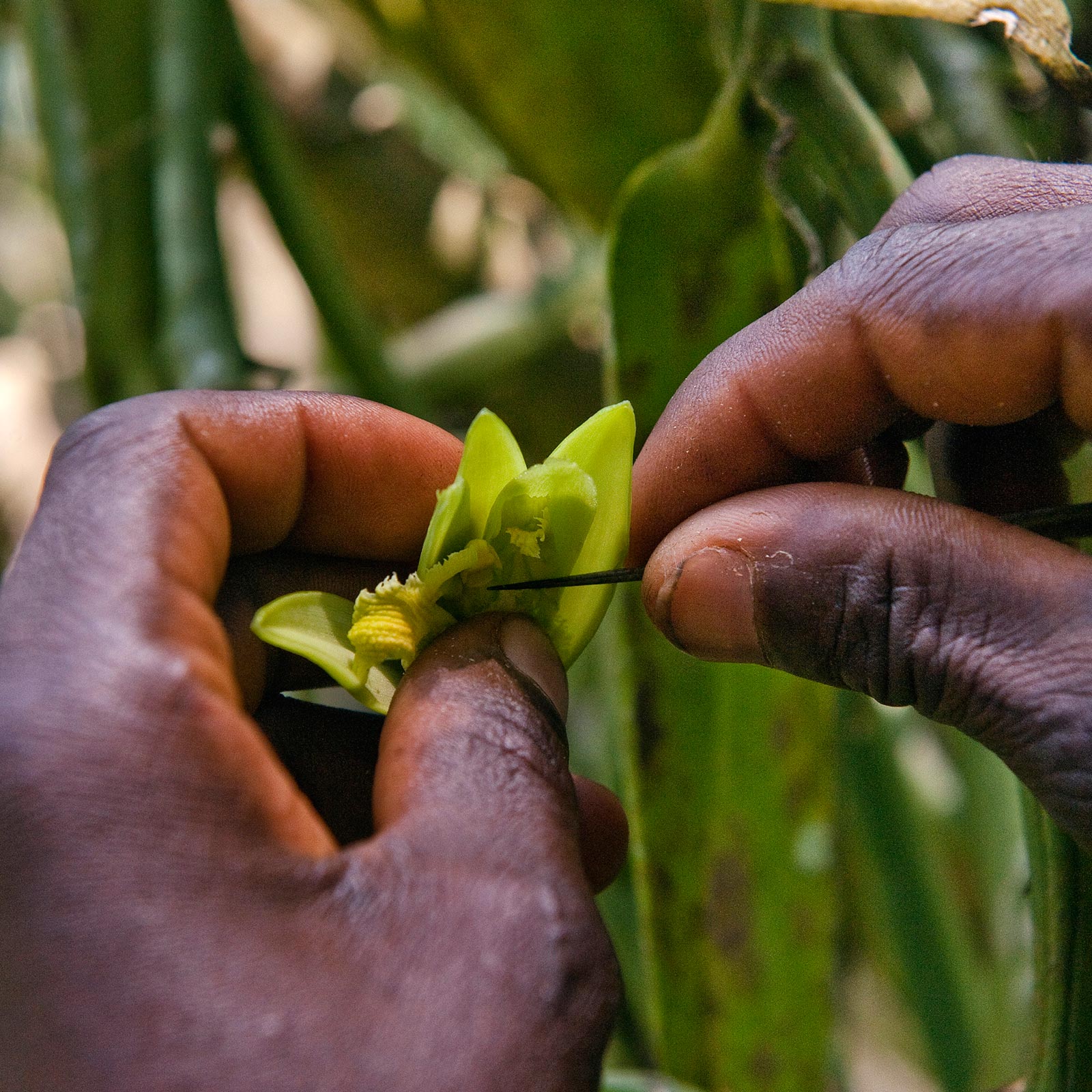 The intricate vanilla flower has to be pollinated by hand using a pin or whittled stick to carefully lift out of the way the flap (rostellum) which separates the stigma and pollen-bearing anther; thumb and forefinger then gently squeeze these male and female parts together.