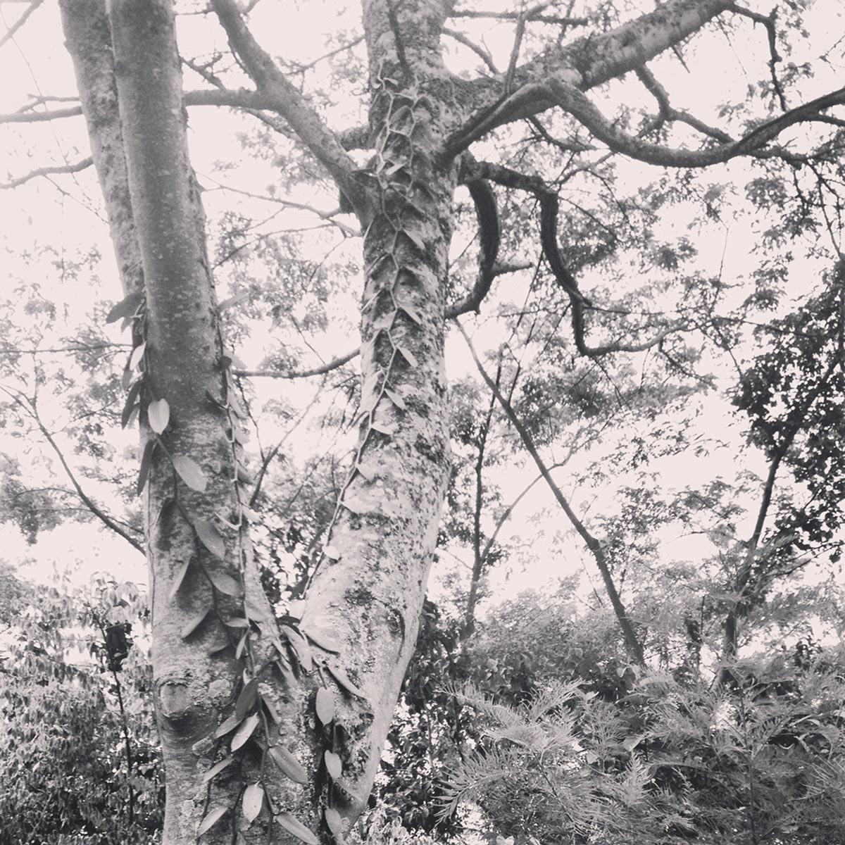 Vanilla is an orchid vine, originally from Central America, and the only one of over 25,000 orchid species to produce an edible fruit. It grows in tropical latitudes stretching to approximately 23° either side of the equator. The vine needs to entwine a host tree – we grow ours up mulberry, physic nut trees, and forest trees.